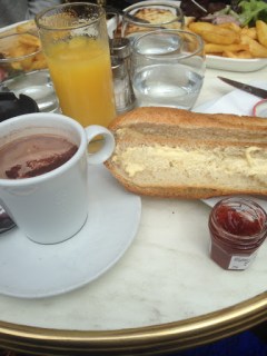 Anyway, we chose a cafe near the hotel that was serving breakfast, but we also asked for lunch menus. My first French meal: “petit dejeuner Francais” which included iced orange juice, chocolat, and bread with jam. It normally also includes a croissant but the employee said “croissant fini,” so I just enjoyed the huge chewy baguette that was sliced, lathered with butter and then my added jam.