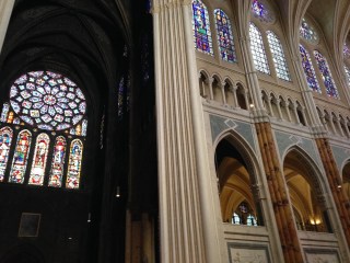 The inside was simply gorgeous. Stained glass panels all around, and huge arches reaching to the ceiling. I was really interested to see that different parts of the walls were different colors – some dirtier and darker than others, while the center was a pristine white. Teo said it just depends on the cleaning; people have cleaned the main hallway around the altar, but some side walls were blackened from pollution and smoke over the years (it’s not a shadow!).
